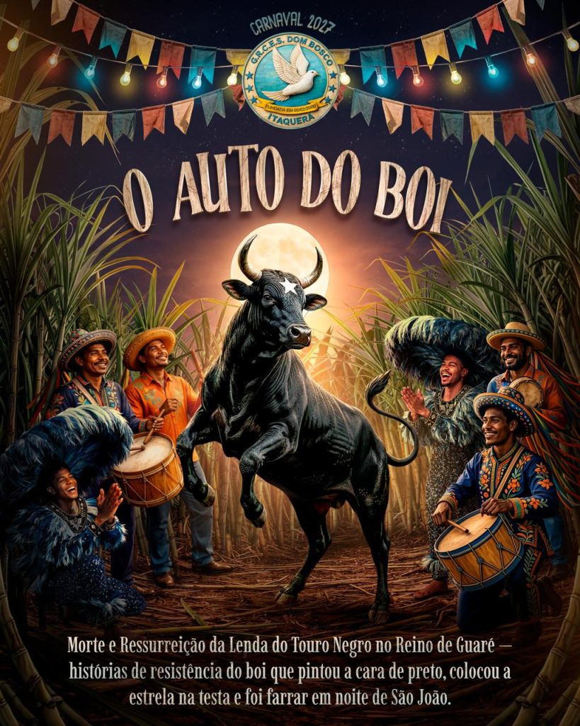 A Dom Bosco de Itaquera anunciou oficialmente, no último sábado (4), o enredo que levará para a avenida no Carnaval de 2027. Com o título “O Alto do Boi — Morte e Ressurreição da Lenda do Touro Negro no Reino de Guaré — histórias de resistência do boi que pintou a cara de preto, colocou a estrela na testa e foi farrar em noite de São João”, a agremiação aposta em uma narrativa marcada por simbolismo, tradição e identidade cultural.