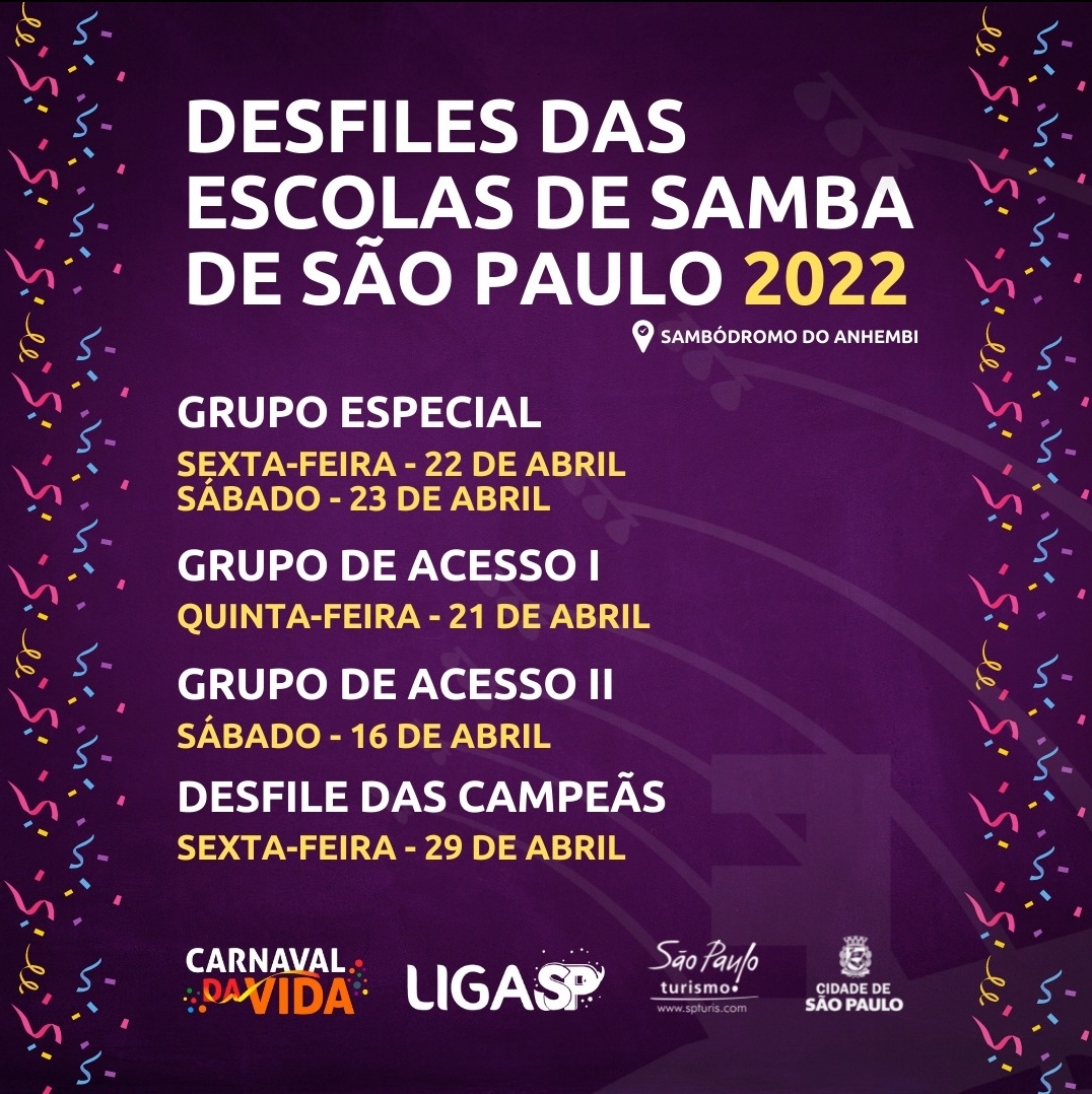 A Liga Independente das Escolas de Samba de São Paulo divulgou em suas redes sociais os dias que acontecerão os desfiles do carnaval 2022, que será realizado no mês de abril. O evento começará em 16 de abril (sabado), com os desfiles das 12 agremiações do grupo de Acesso 2. Já