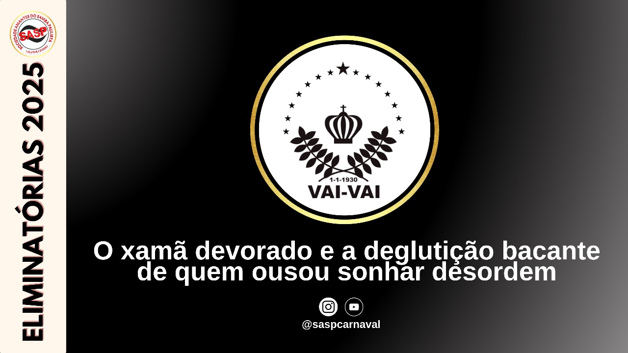 Ouça aqui os sambas concorrentes da Vai-Vai para o Carnaval 2025. A escola da Bela Vista levará para o Anhembi o enredo O Xamã Devorado y a Deglutição Bacante de Quem Ousou Sonhar Desordem, desenvolvido pelo carnavalesco Sidnei França, e será a última escola a desfilar no sábado de carnaval, pelo
