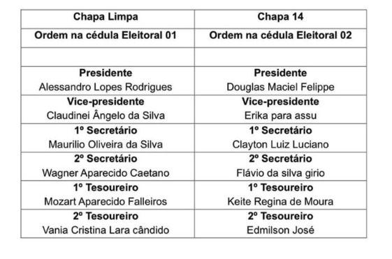 Duas chapas foram aprovadas pela comissão eleitoral para concorrer ao pleito. A “Chapa Limpa” é encabeçada por Alessandro Lopes Rodrigues, mais conhecido como Zóio, que é o atual presidente da entidade e tentará a reeleição. Já a “Chapa 14”, que tem como presidente Douglas Maciel Felippe, conhecido como Tio Dô, compositor e integrante antigo da agremiação. Confira as chapas completas: