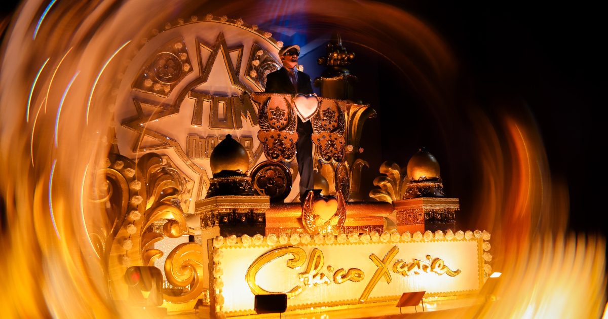 Um elemento que reforça ainda mais a aura simbólica do desfile é o fato de a Tom Maior se apresentar, pela primeira vez, exatamente no dia de seu aniversário, agregando significado especial à apresentação no Anhembi. A proposta de Flávio Campello se afasta do formato tradicional dos chamados ‘enredos CEP’. Ao escolher uma das personalidades mais emblemáticas ligadas à cidade de Uberaba, o carnavalesco constrói uma narrativa dupla, que entrelaça a trajetória espiritual de Chico Xavier com a história e a identidade da cidade mineira. Essa conexão se dá por meio de uma carta psicografada, recurso central da sinopse, em que Chico, a partir de outro plano espiritual, relata as belezas naturais, curiosidades e a rica herança cultural de Uberaba.